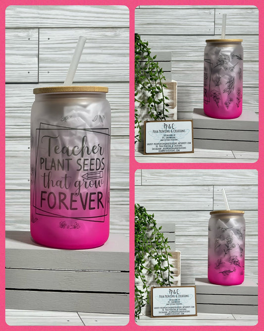 16oz. TEACHERS PLANTS SEEDS THAT GROW FOREVER FROSTED OMBRE' GLASS CAN TUMBLER