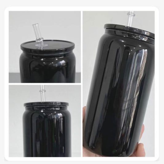 BLACK GLASS CAN TUMBLER W/ACRYLIC LID
